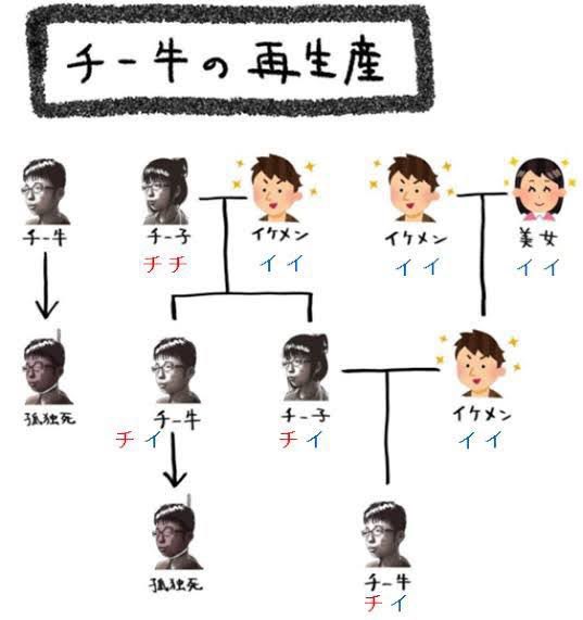 遺伝的には女次第、しかも母親は子どもがチー牛であることを望むから、非チー牛遺伝子でもチー牛になってしまう。父親がどれだけ矯正できるかが課題や