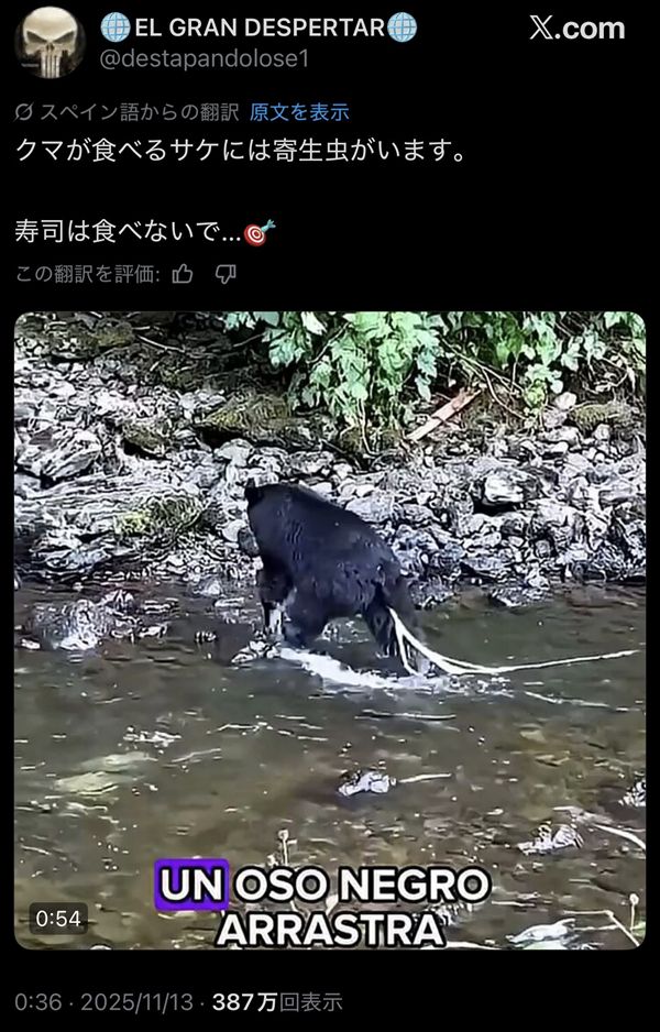【動画】クマサン、生魚食いすぎてケツから寄生虫🪱垂れ流しwwwwww