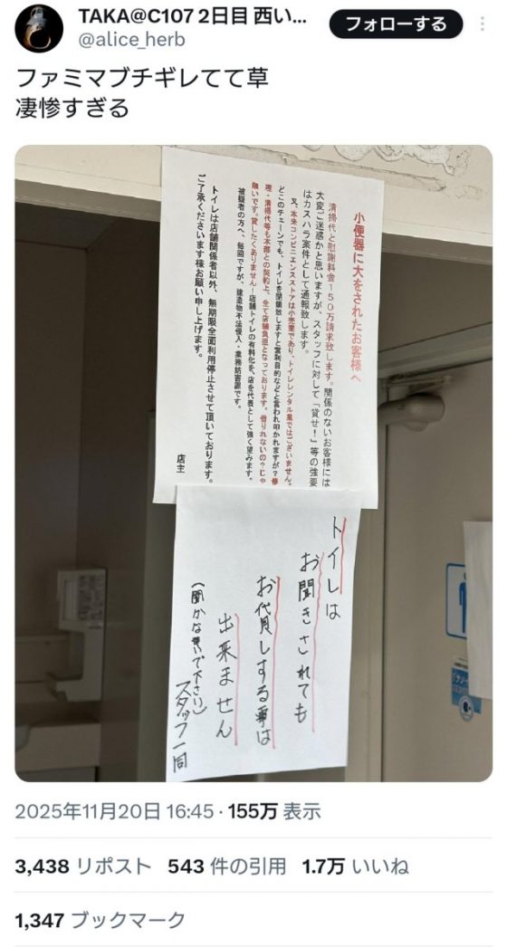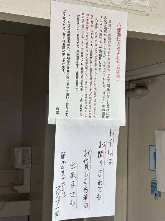 【悲報】ファミマ、小便器に大をされてガチギレ、トイレ使用不可に