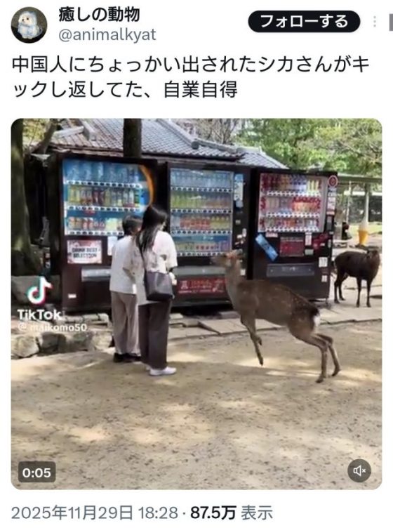 中国人にちょっかい出されたシカさんがキックし返してた、自業自得