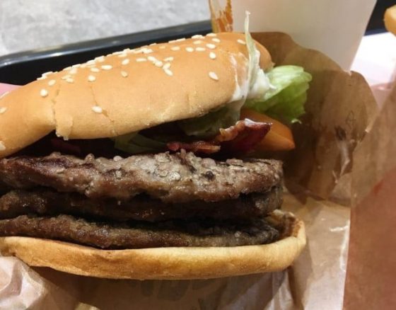 肉がバンズを食ってら