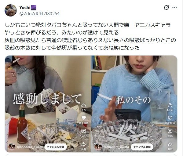 肺に入れてるように見えないっていうイチャモンならまだ分かるが2~3口だけ吸ってすぐ消してまた次の点ける人はざらにいる
