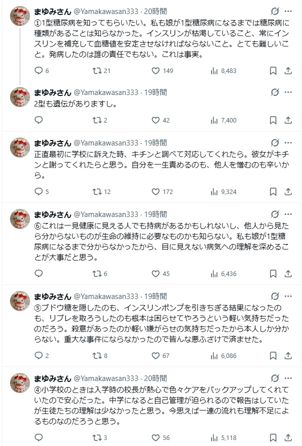 しかし同級生によるいじめは、この弱点を徹底的に突く残酷なものだった。インスリンポンプのチューブを引きちぎって機能を停止させたり、血糖測定器を盗もうとしたり、低血糖時に必要なブドウ糖を隠して嘲笑したりした。